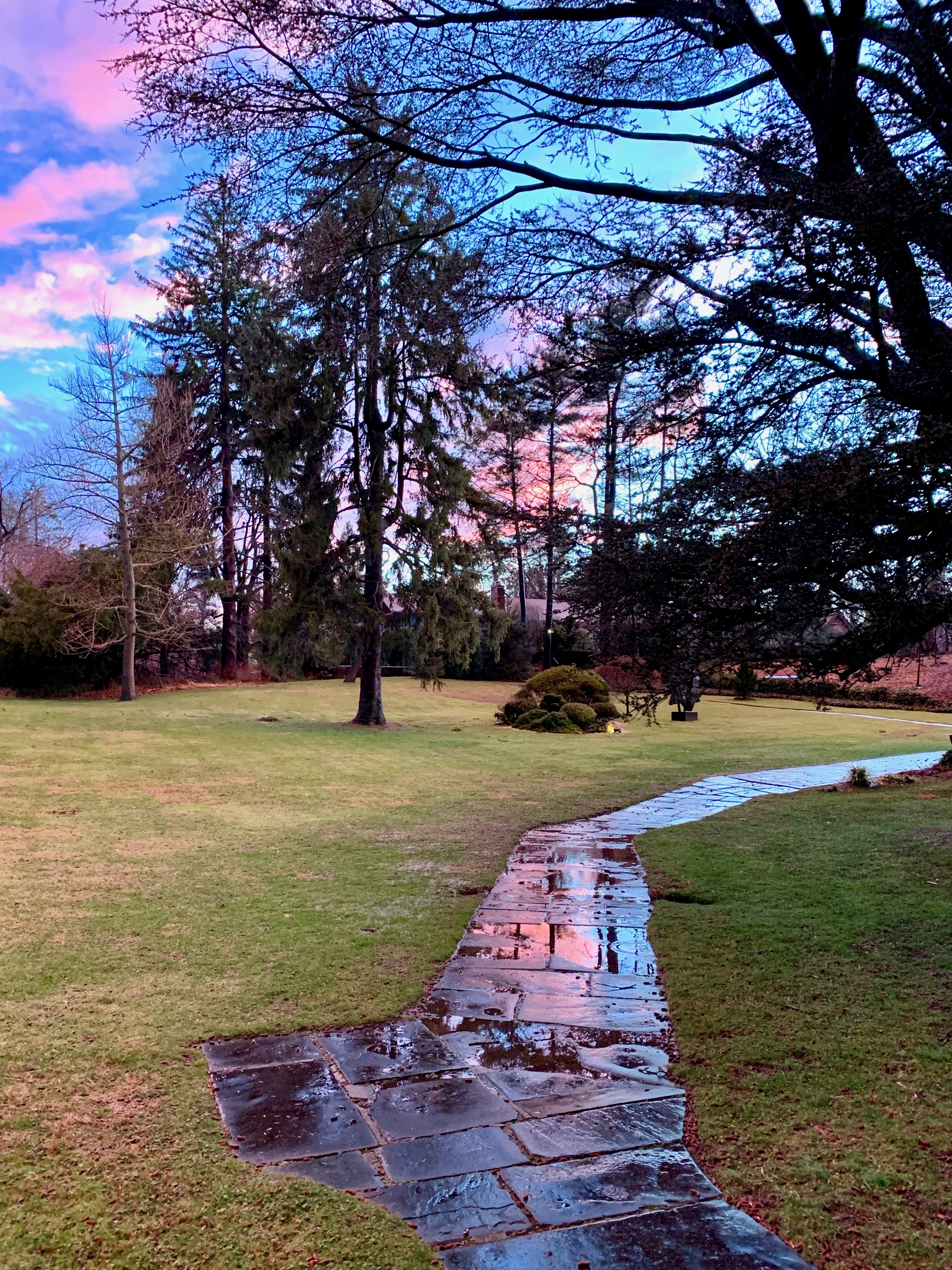 Speaking of awe-inspiring things… That same day, it rained torrentially for hours and hours. Within minutes of my time with those students, the rain ended. Apparently others in the area witnessed a perfect, sky-spanning double rainbow. I missed that, but I happened to glance out the window to see sunset illuminating the sky and reflecting off the puddles left by the rain.
